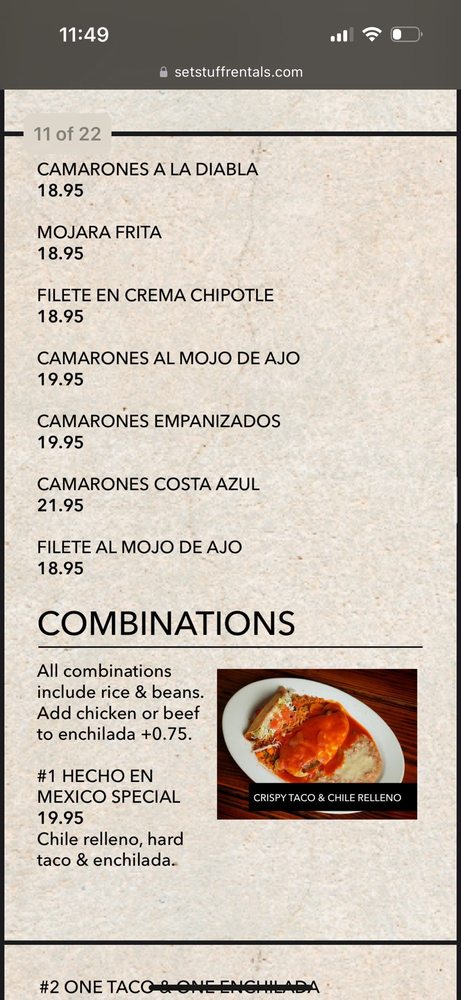 Marinated steak and a red cheese enchilada. Served with grilled onions, rice, and beans.