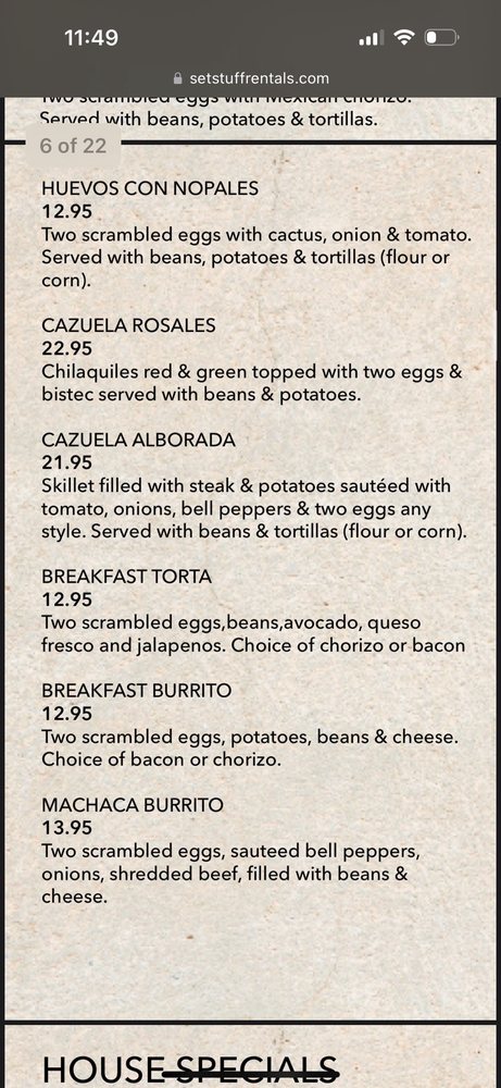 scrambled eggs with cactus, onion and tomato. Served with beans, potatoes and tortillas (flour or corn).