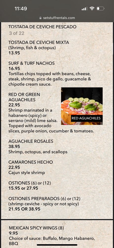 Shrimp marinated in a habanero lime salsa. Topped with avocado slices, purple onion, cucumber and tomatoes. Spicy.